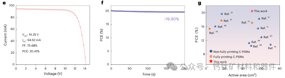 光伏性能与运行稳定性。e,f,冠军4FP C-PSMs的I–V曲线(e)和稳态输出(f)。g,报告的C-PSMs的功率转换效率(PCE)与有效面积关系。(消息来源: Nature Photonics)