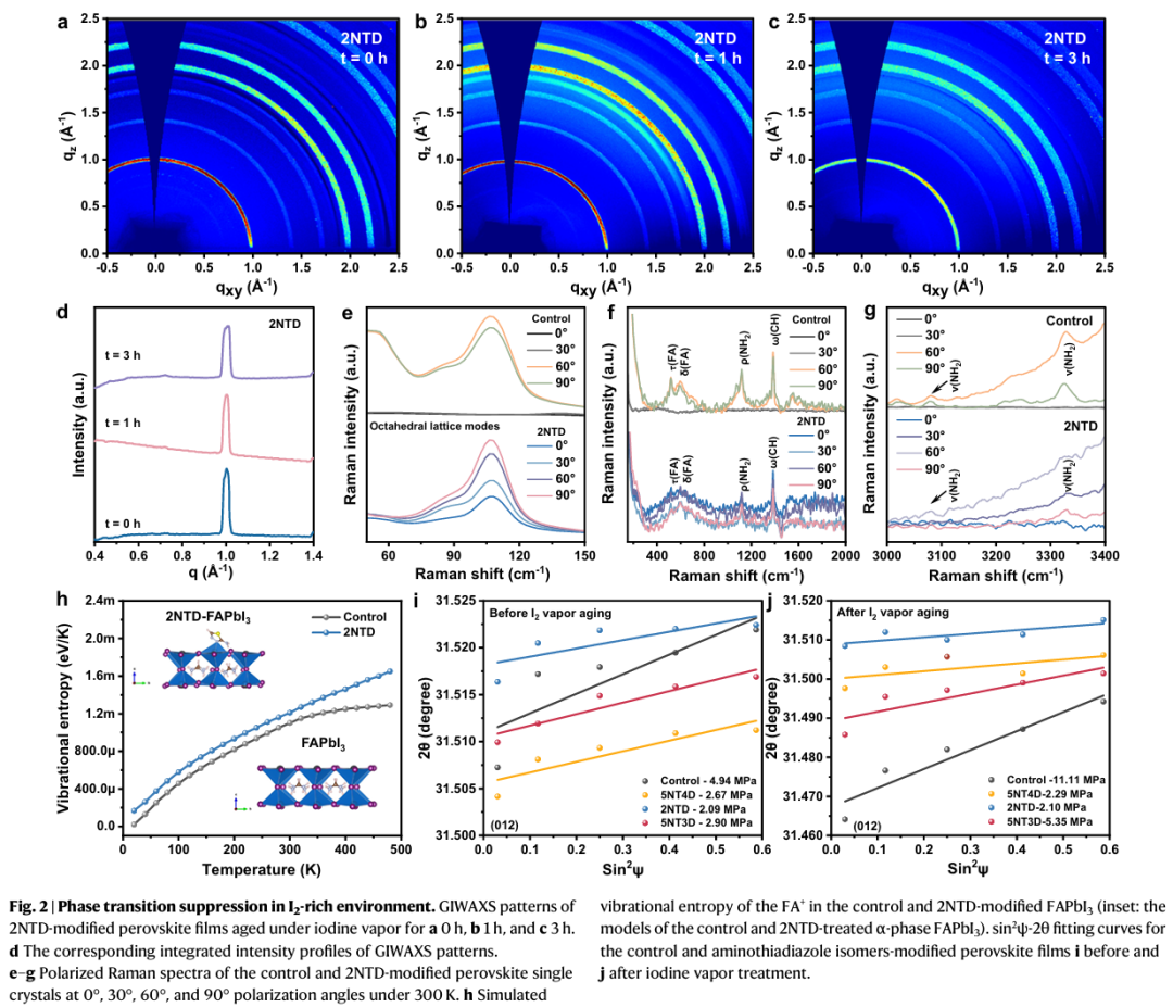 - 高熵态FA⁺增强相稳定性:2NTD促进FA⁺无序排列与高熵态,抑制α相向非光活性δ相转变,同时缓解晶格应变,提高材料结构鲁棒性。