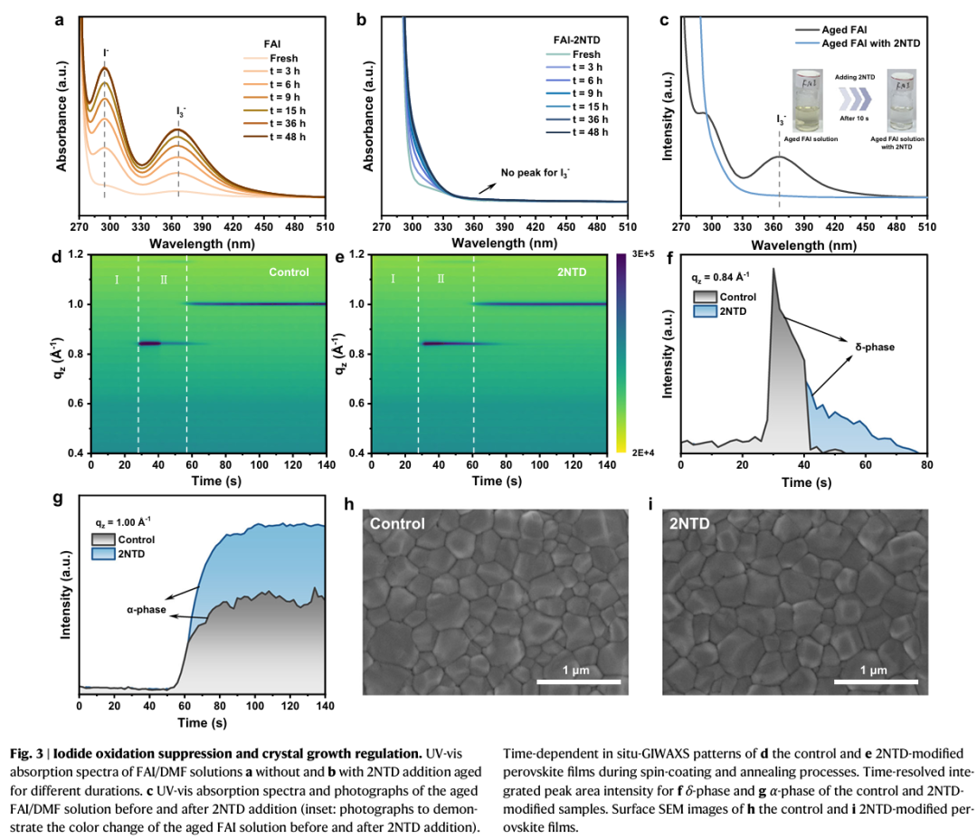 - 碘物种抑制与缺陷钝化协同作用:2NTD有效清除I₂/I₃⁻物种,减少自降解反应,钝化碘空位、铅空位等缺陷,显著降低非辐射复合损失。