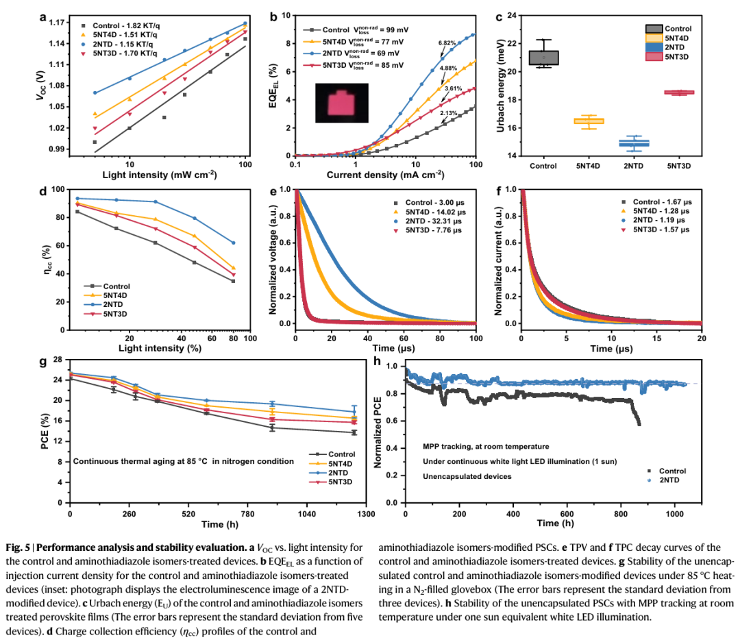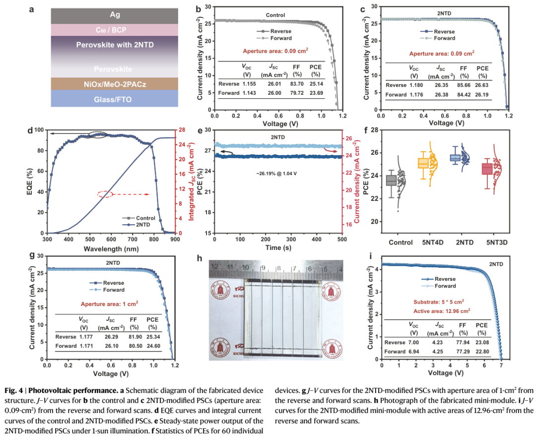 - 高效稳定的倒置钙钛矿太阳能电池:通过2NTD调控FA⁺构型熵,实现26.63%的高效率(认证26.40%),并显著提升器件在高温与光照下的长期稳定性。