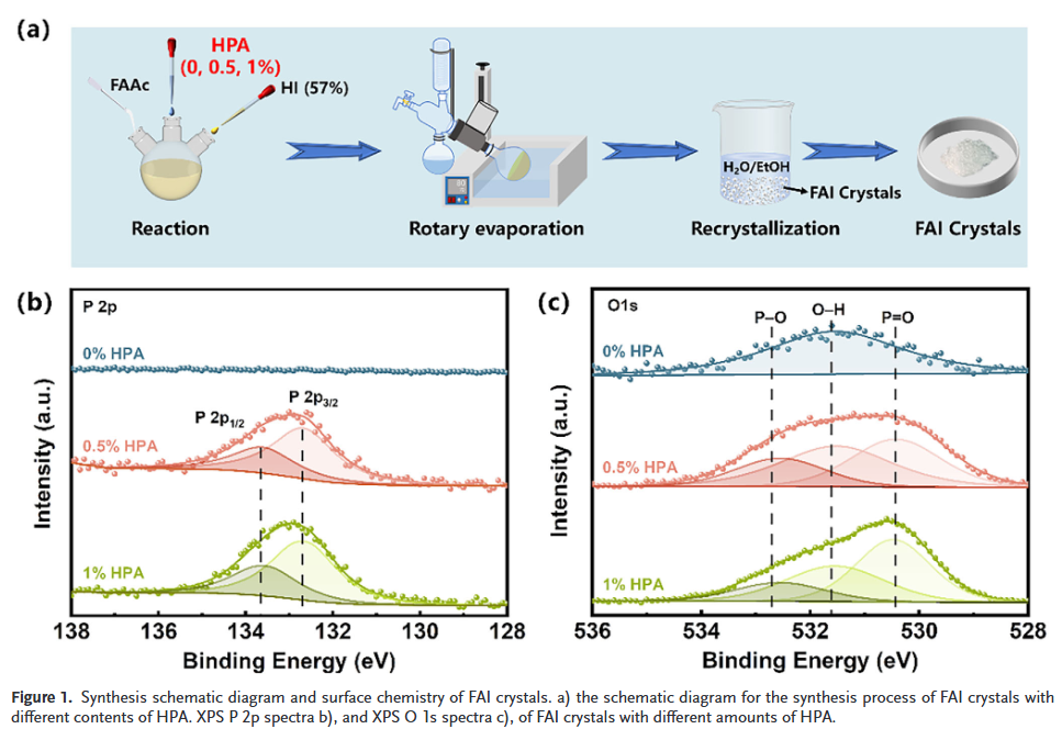 - 原料级创新策略:在FAI合成过程中原位引入次磷酸甲脒配合物,实现磷元素的“锚定”,避免传统后处理添加的复杂工艺,降低成本并提升工艺兼容性。