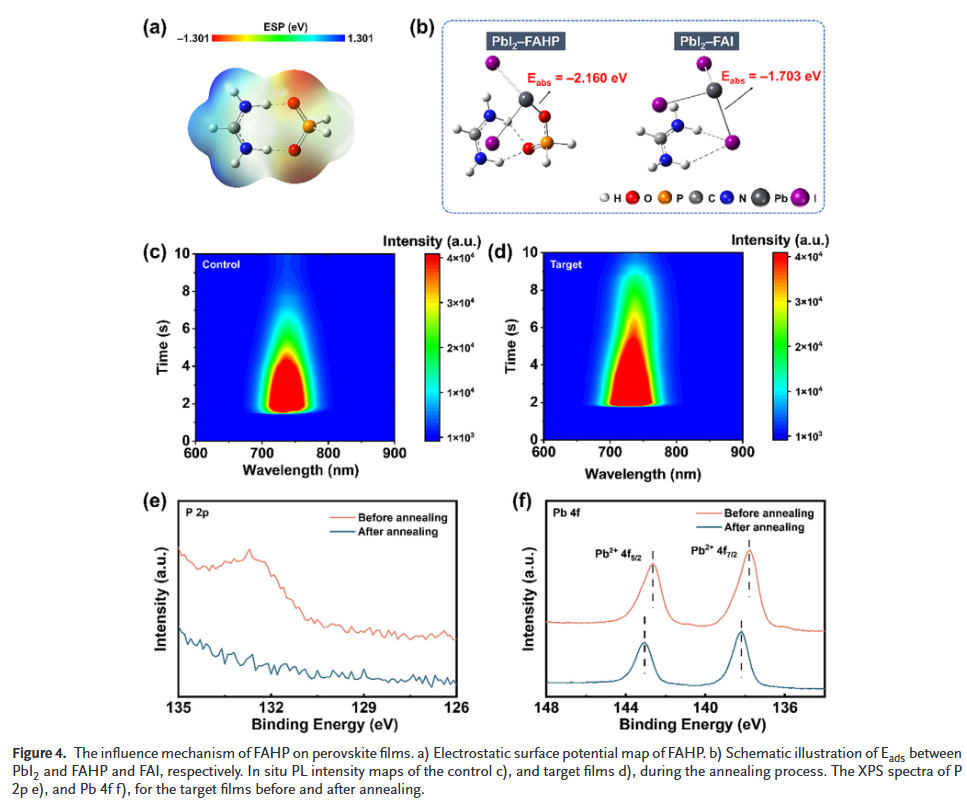 - 结晶动力学调控:FAHP与Pb²⁺配位形成中间体,退火时分解延缓结晶过程,促进晶粒长大、抑制PbI₂残留,显著提升薄膜质量和相分布均匀性。