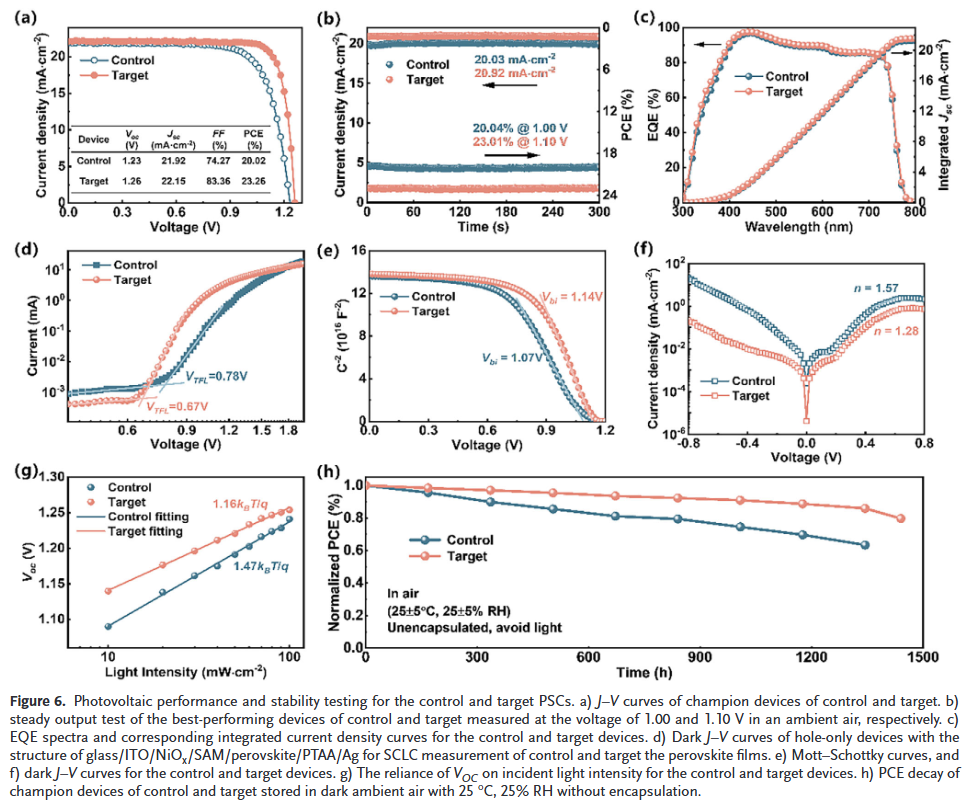 - 高效稳定兼具:宽带隙器件效率从20.02%提升至23.26%,开路电压达1.26 V,未封装器件在空气中1400小时保持80%以上效率,展现出优异的实际应用潜力。