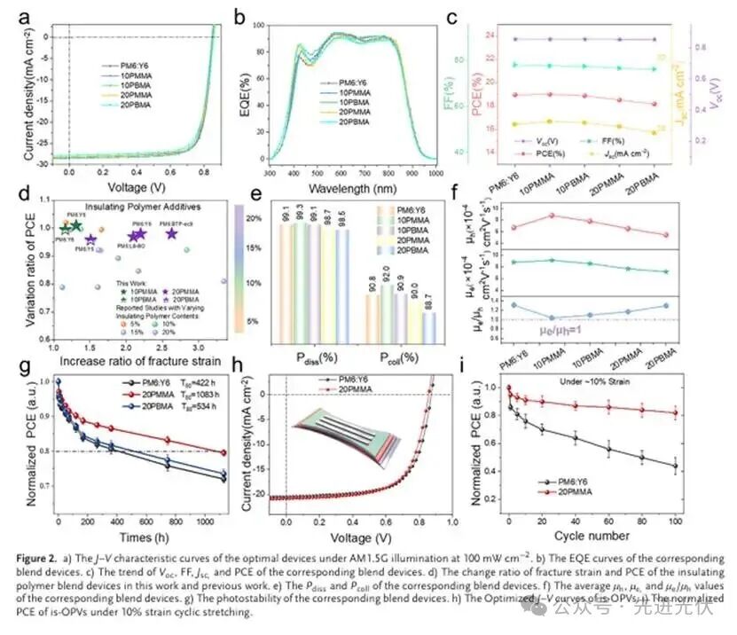 此图系统比较了不同绝缘聚合物添加剂对器件光电性能和机械稳定性的影响。PMMA基器件在效率(PCE达19.01%)和拉伸性(断裂应变提升2.2倍)方面均优于PBMA基器件,其优异的电荷收集效率、平衡的载流子迁移率以及循环拉伸下87%的PCE保持率,凸显了PMMA在解耦效率-拉伸性矛盾中的关键作用。