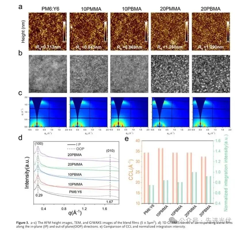 通过AFM、TEM和GIWAXS表征,揭示了PMMA和PBMA对活性层微观结构的调控差异。PMMA的引入在保持较低表面粗糙度的同时,显著增强了π-π堆叠强度和结晶相干长度,而PBMA则因结晶动力学受阻导致有序性下降。这种结构优化直接关联于PMMA基器件更高的电荷传输效率。