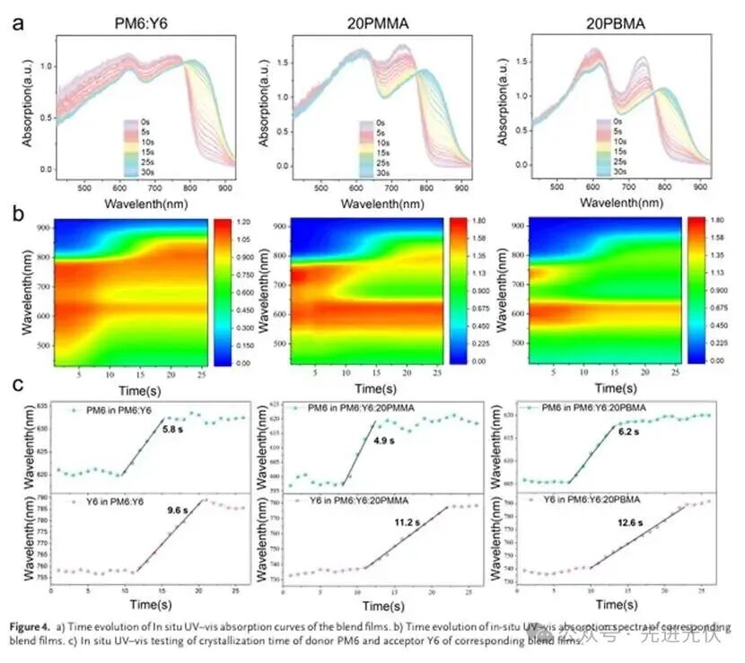 基于原位紫外-可见吸收光谱,分析了PMMA和PBMA对PM6和Y6结晶路径的影响。PMMA加速了PM6的预聚集(结晶时间缩短至4.9秒),同时抑制Y6的过度结晶,而PBMA则延缓了两组分的结晶过程。这种动力学差异进一步印证了PMMA通过促进给体相有序化而优化器件性能的机制。