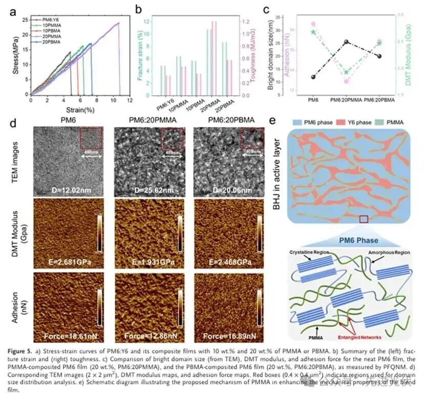 通过应力-应变曲线和纳米力学映射,明确了PMMA大幅提升薄膜断裂应变(10.8%)和韧性(1.21 MJ m⁻³)的效果。结合PFQNM和PiFM分析,发现PMMA选择性分布于PM6无定形区形成纠缠网络,而PBMA因空间限制难以有效增韧。该机制示意图清晰展示了“刚区更刚、柔区更柔”的双重调控策略。