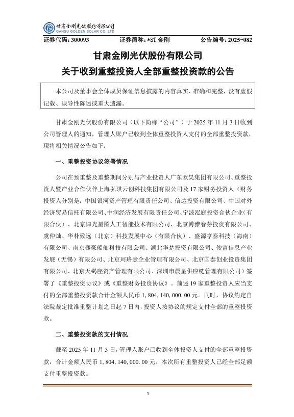 近日,金刚光伏发布公告称,公司当日收到管理人通知,管理人账户已足额收到全体重整投资人支付的 18.04 亿元重整投资款。