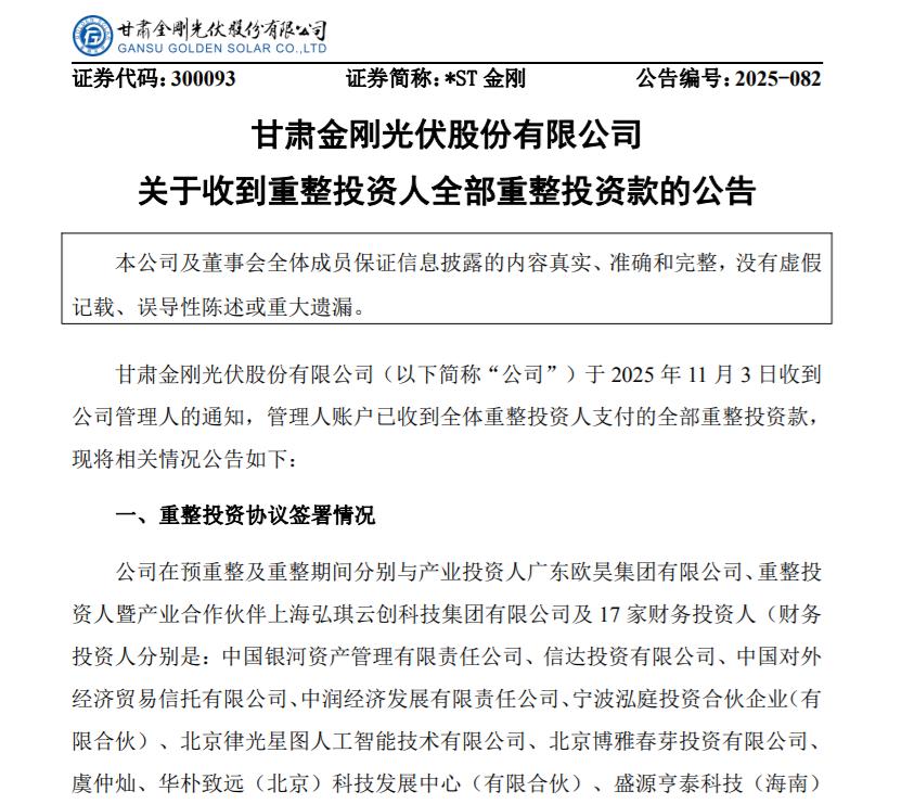公告显示,金刚光伏在预重整及重整期间,已与产业投资人广东欧昊集团、重整投资人暨产业合作伙伴上海弘琪云创科技集团及 17 家财务投资人签署相关投资协议。根据约定,投资人需在法院裁定批准重整计划后 7 日内足额支付投资款,此次款项如期到账,标志着重整投资环节已顺利完成。