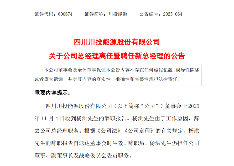 四川川投能源股份有限公司于2025年11月4日收到总经理杨洪的辞职报告,因工作原因辞去总经理职务,辞职自送达董事会时生效。杨洪辞任后仍担任公司董事、副董事长及战略委员会委员。公司于2025年11月5日召开第十一届四十二次董事会,审议通过聘任黄强为公司总经理,任期自董事会审议通过之日起至第十一届董事会任期届满之日止。