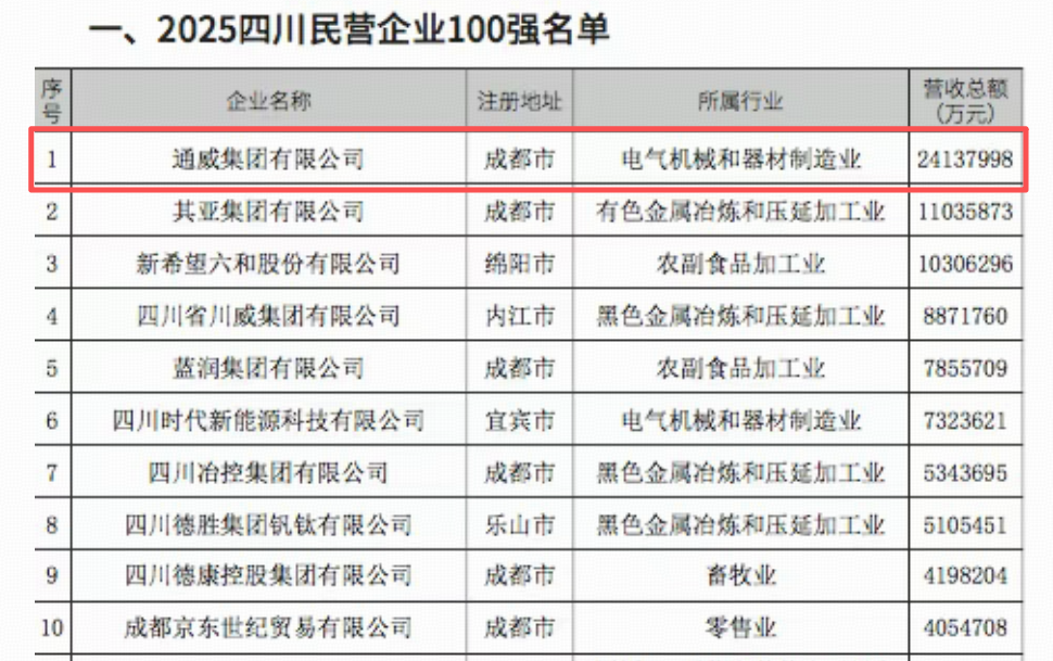 通威集团荣登“2025四川民营企业100强”榜单榜首