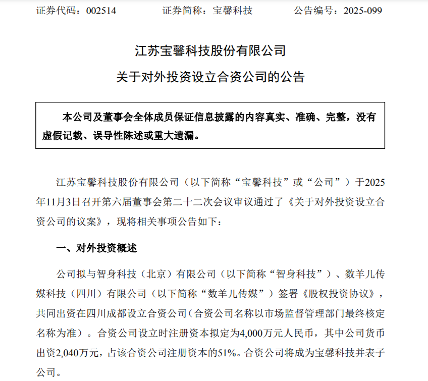 11月5日,宝馨科技(002514.SZ)公告拟与智身科技、数羊儿传媒在成都合资设立公司,注册资本4000万元,公司以2040万元持股51%并实现并表,业务聚焦人形及四足机器人领域。这是其继光伏跨界失利后,年内第三次加码新赛道。