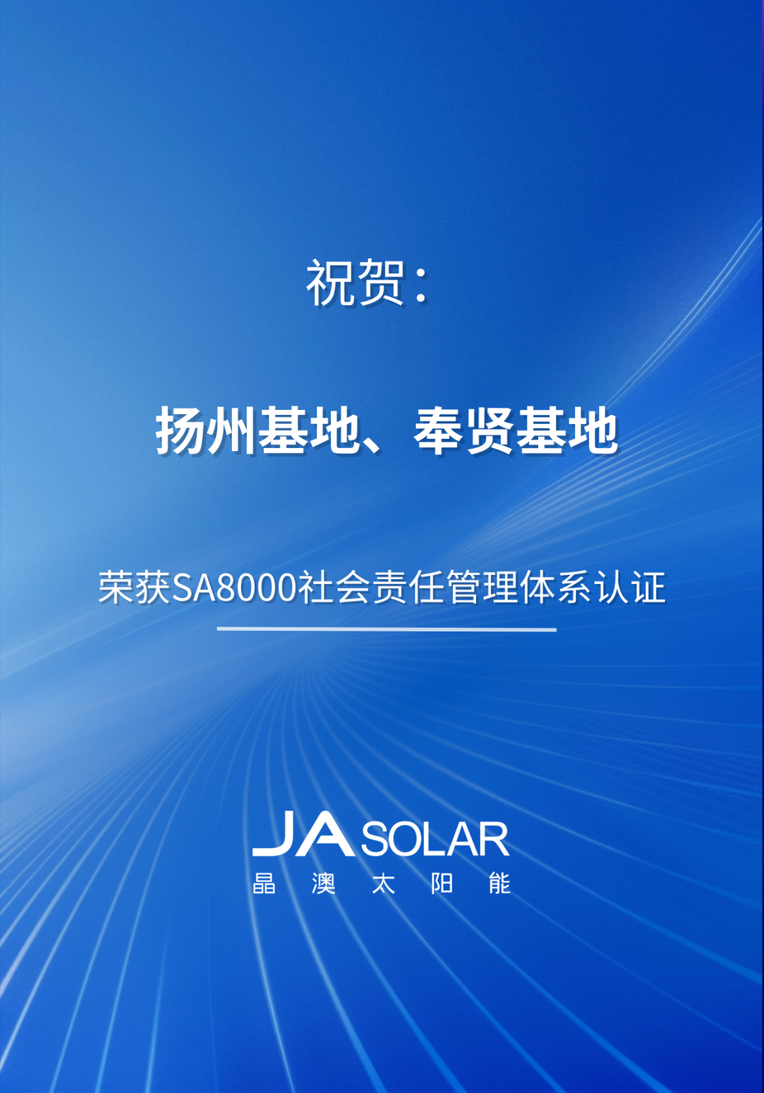 近日,晶澳扬州及奉贤生产基地传来喜讯——两大基地首次获得SA8000社会责任管理体系认证,该认证由国际权威机构TÜV Italia S.R.L.(TÜV SUD集团)颁发。该认证的获得,标志着两基地在社会责任管理与员工权益保障等方面的实践已达到国际认可标准。