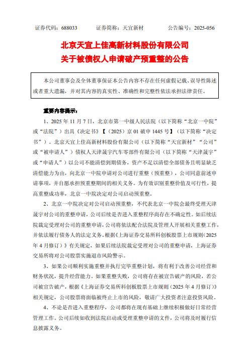11 月 9 日,天宜新材(688033)发布公告称,公司于 11 月 7 日收到北京第一中级人民法院(简称 “北京一中院”)出具的《决定书》【(2025)京 01 破申 1445 号】,法院依照《中华人民共和国企业破产法》相关规定,决定对公司启动预重整。