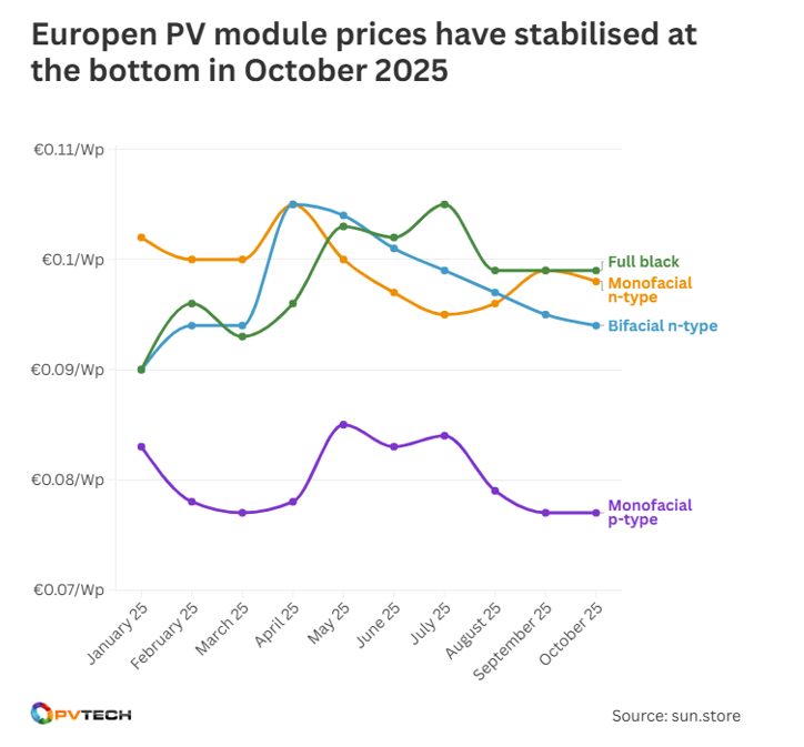 据欧洲太阳能市场平台sun.store称,欧洲光伏组件价格的低波动性在10月份的生产和需求之间达到了持续平衡。