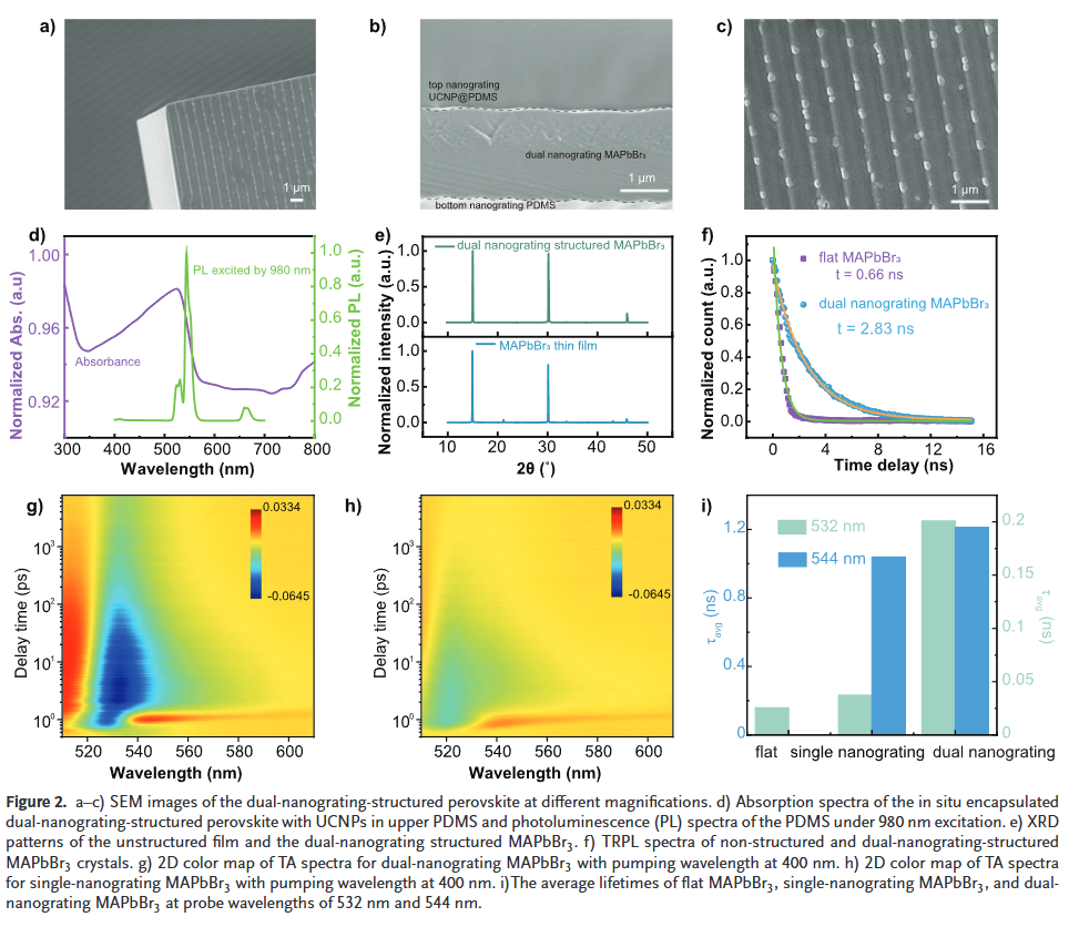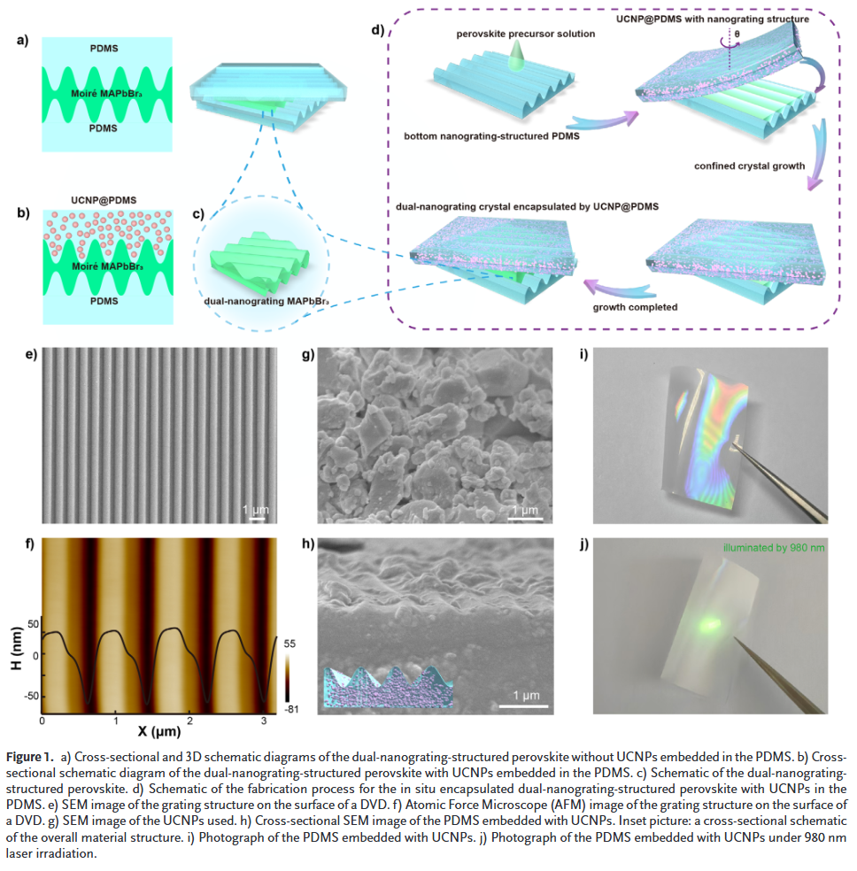 钙钛矿材料在近红外光电探测器中的应用受限于其不稳定性和低吸收率。本研究吉林大学李顺心等人通过引入双纳米光栅和上转换纳米颗粒(NaYF₄:20%Yb,2%Er),增强了MAPbBr₃的稳定性并将其光谱响应扩展至近红外范围。