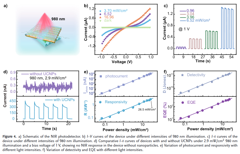 - 高性能近红外探测:在980 nm波长下实现2.9 A·W⁻¹的高响应度和1.34×10¹¹ Jones的探测率,优于多数已报道的钙钛矿近红外探测器。