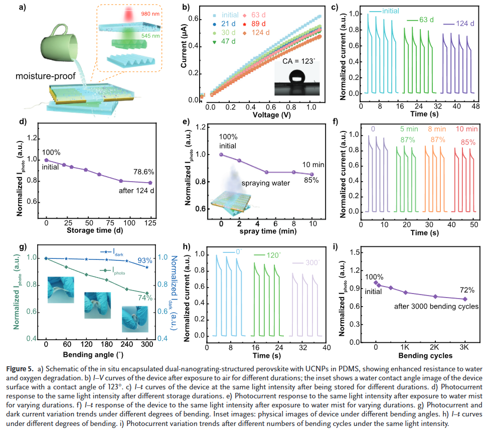 基于此方法制备的光电探测器在980 nm波长下实现了2.9 A·W⁻¹的响应度和1.34×10¹¹ Jones的探测率。该器件在空气中暴露4个月后仍保持78.6%的性能,经历3000次弯曲循环后仍保持72.4%的性能,在稳定性和柔性方面表现出显著提升。