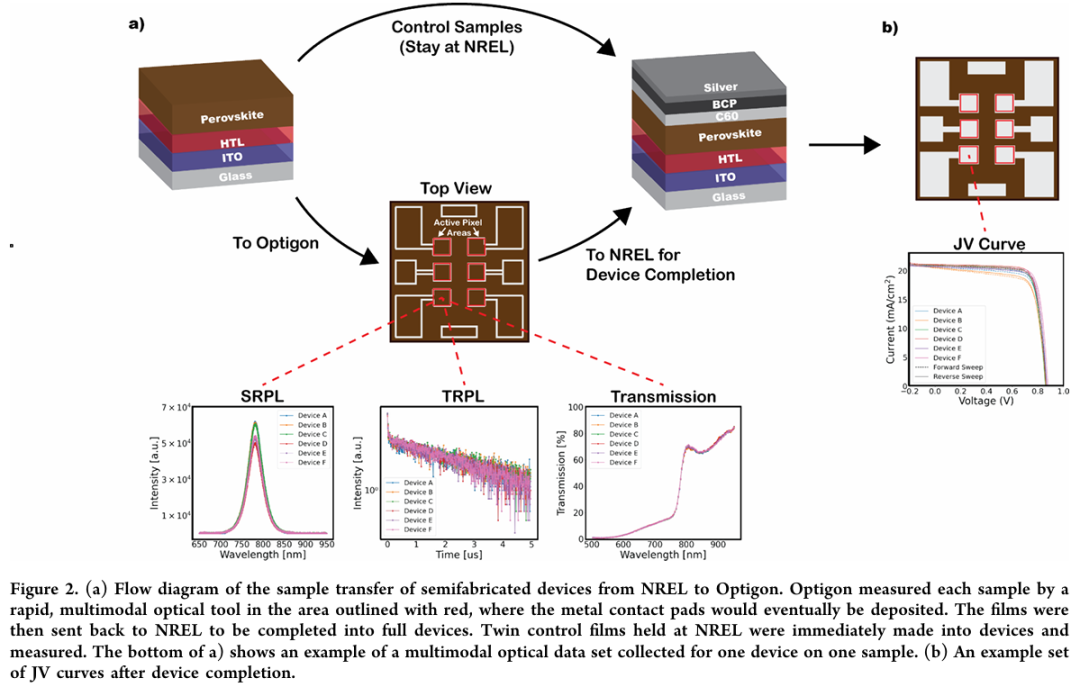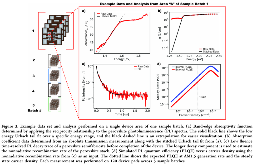 本研究美国马萨诸塞州萨默维尔市 Optigon 公司Dane W. deQuilettes等人展示了一种多模态测量方法,可在制备过程中快速测定超过100个钙钛矿器件的最大可实现开路电压及其预测值。通过将这些测量集成在单一平台中,实现了多种数据的同步采集。我们证明,这些数据与自动化分析可用于快速理解并预测先进器件结构中开路电压的定量变化趋势。所提出的数据与自动化分析流程为快速筛选可提升开路电压的吸光层与电荷传输层组合提供了可靠途径。