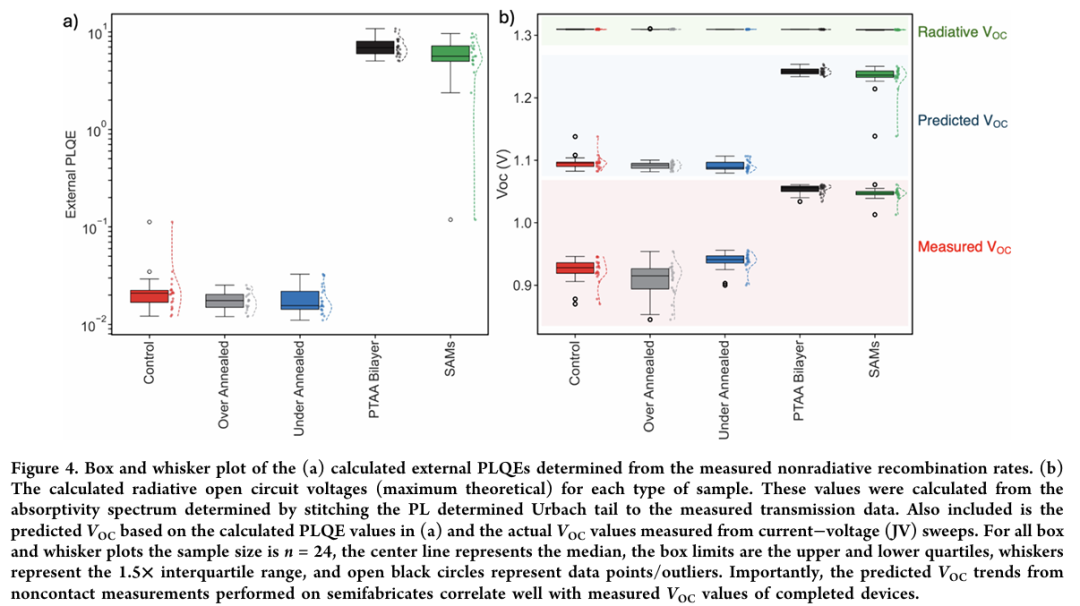 - 成功预测器件性能趋势:通过光学数据准确预测不同HTL与钙钛矿处理条件下的VOC变化,揭示界面非辐射复合是主要电压损失来源。