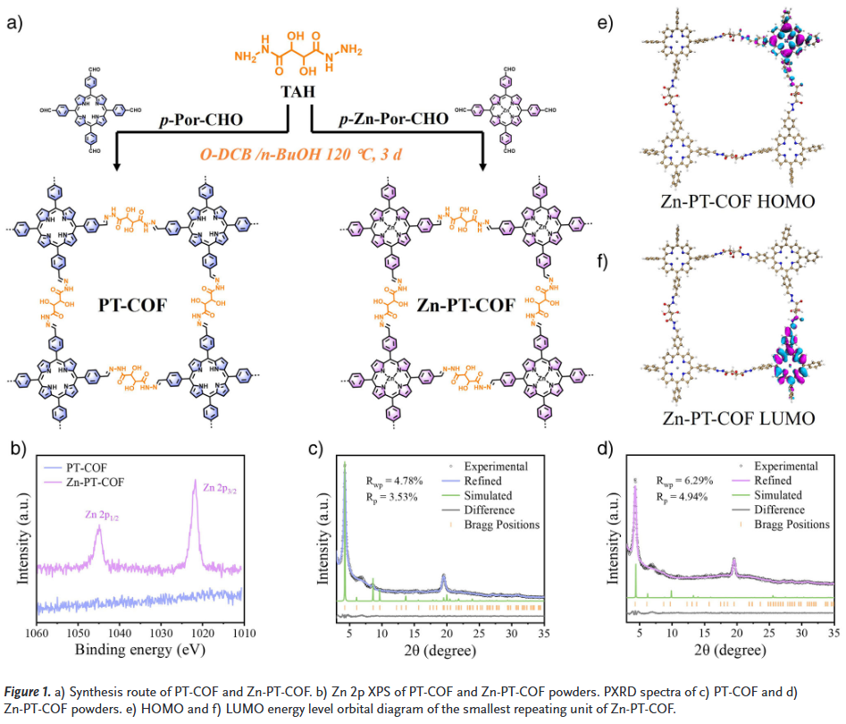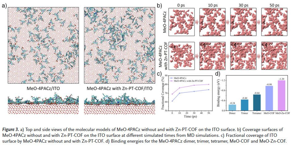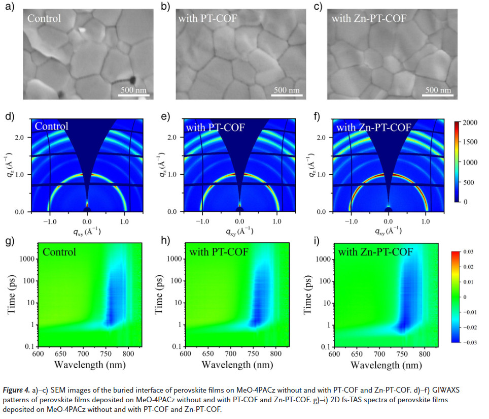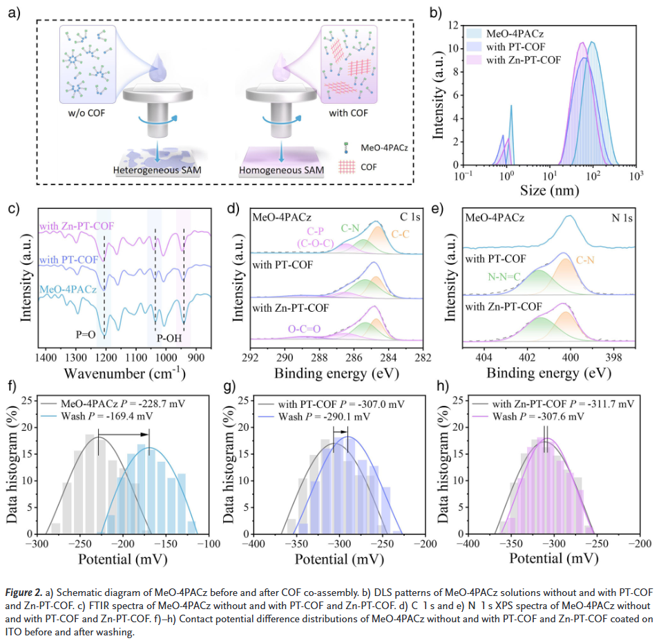 - COFs协同修饰实现SAM均质化与多功能提升:通过引入PT-COF和Zn-PT-COF,利用π-π相互作用与氢键有效抑制MeO-4PACz分子聚集,同步提升SAM的均匀性、导电性与润湿性。