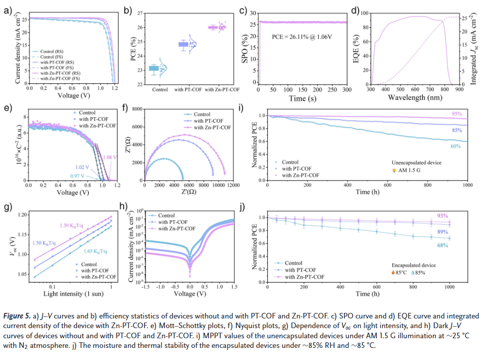 - 器件效率与稳定性双双突破:基于Zn-PT-COF修饰的倒置PSC实现26.39%的冠军效率(认证26.12%),并在连续光照1000小时后仍保持95%的初始效率,展示出卓越的运行与湿热稳定性。