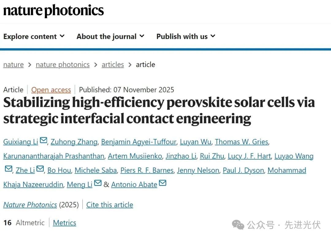 Li, G., Zhang, Z., Agyei-Tuffour, B. et al. Stabilizing high-efficiency perovskite solar cells via strategic interfacial contact engineering. Nat. Photon. (2025).