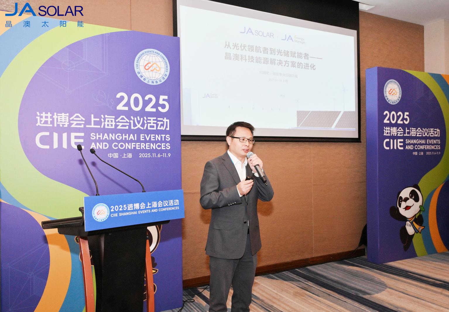 11月8日,2025年中国国际进口博览会期间,“智慧储能调频与国际电力安全发展论坛”在上海成功举办。论坛由中国机电产品进出口商会与晶澳科技联合主办,吸引了来自政府部门、国际组织、行业领军企业及权威机构的众多代表,共同探讨储能技术创新与全球电力安全协同发展的路径。晶澳科技储能事业部副总裁付海明受邀参加并发表《从光伏领航者到光储赋能者——晶澳科技能源解决方案的进化》的主题演讲。