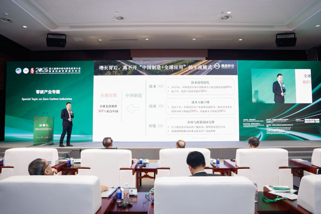 在题为《光伏驱动全球绿色发展 通威践行可持续发展新路径》的主题演讲中,陈总深刻剖析了全球光伏产业发展格局,并表示,光伏产业的爆发式增长离不开“中国制造+全球应用”模式的成功实践。尽管当前行业面临供需波动、技术迭代、政策调整等内外挑战,但这一模式凭借技术成熟度、成本经济性、规模效应等核心优势,仍是应对全球气候变化、实现能源结构转型的最优解。