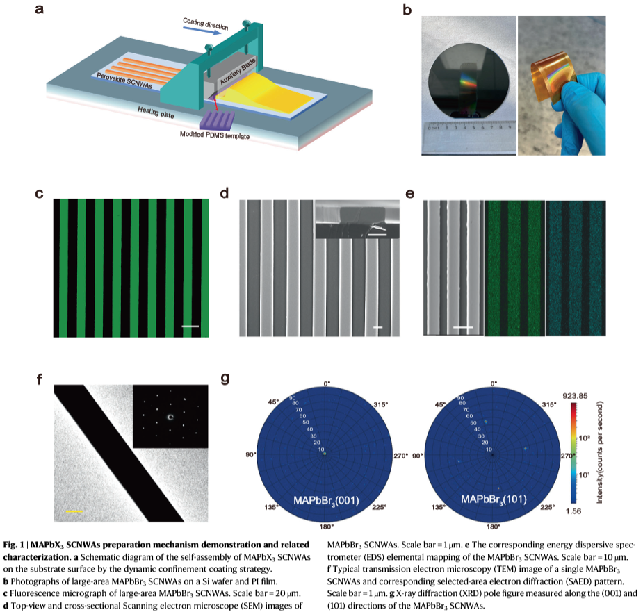 有序的一维钙钛矿单晶纳米线阵列结合了高比表面积、定向电荷传输和机械柔性的优势,通常通过溶液或气相法结合硅、PDMS、光刻胶或氧化铝等模板来控制晶体生长。然而,这些模板的尺寸限制制约了阵列的可扩展性。