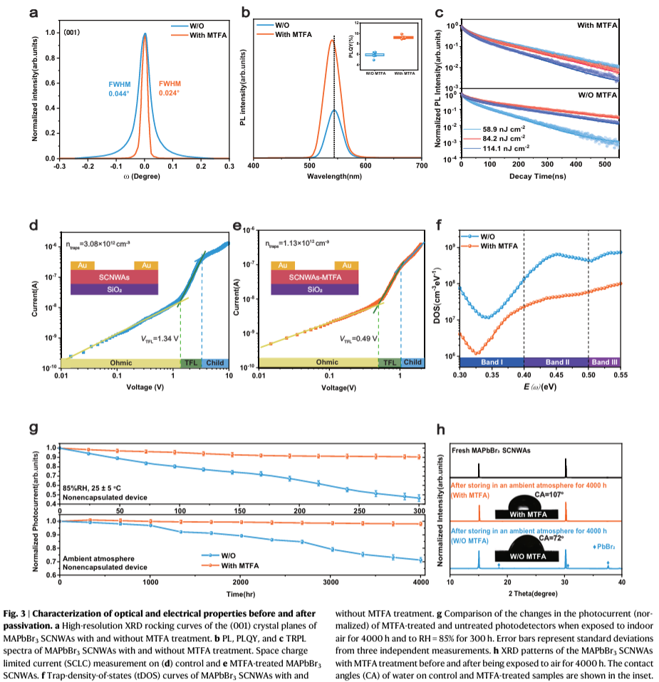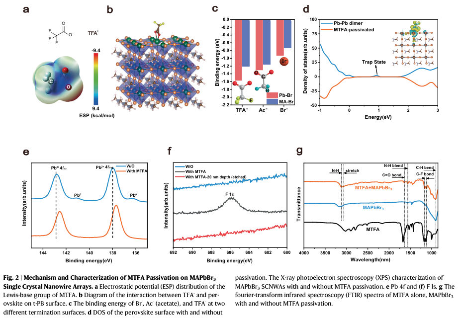 - 引入含氟钝化剂MTFA,通过路易斯碱配位与氢键双重作用有效钝化表面缺陷,将陷阱密度降低近一个数量级,并显著增强材料稳定性。