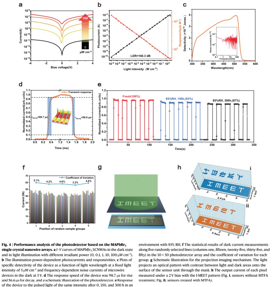- 制备出高性能光电探测器,探测率达3.9×10¹⁴ Jones,线性动态范围达160.3 dB,且在85%湿度下300小时仍保持90.3%性能,展现出优异的环境稳定性。