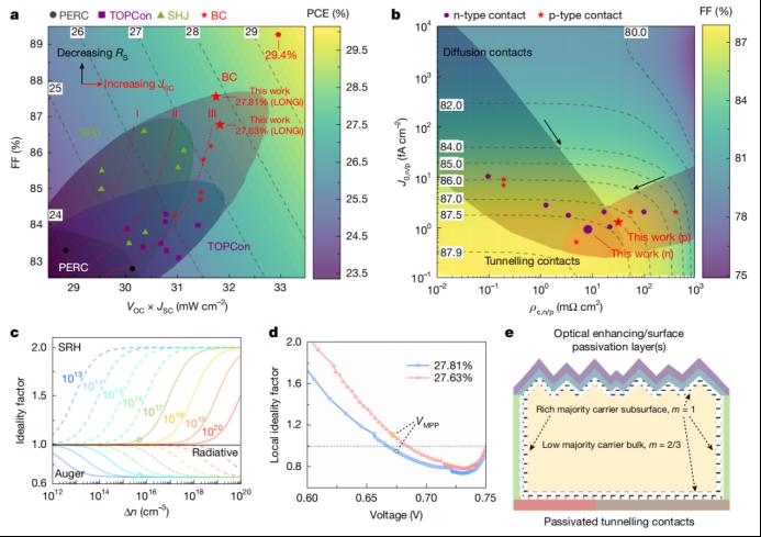 (3)开发了原位边缘钝化技术,在电池制造过程中同步为脆弱的切割边缘“穿上”牢固的钝化外衣,有效抑制了边缘区域的载流子复合。基于器件优异的全钝化表面和电学性能表现,研究团队进一步构建出了一个将二极管的理想因子与载流子损失机制相关联的新的物理模型,定量描述了不同复合机制对理想因子的影响,阐明了体复合和表面复合对填充因子的制约原理,为高性能电池设计提供了清晰的理论指导。