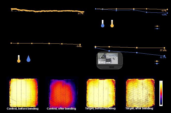 钙钛矿/晶硅叠层电池技术通过融合两种半导体材料的优势,将理论效率大幅推高,是公认的新一代颠覆性光伏技术。传统固有认知认为单晶硅是刚性脆性材料,然而硅的原子结构具有一定弹性形变能力,当硅片厚度降至几十微米(传统硅片厚度通常约为120-200微米)时,纵使其弯曲半径低于2厘米,硅片表面应力仍然低于其本征断裂阈值,而不会产生裂纹,因此超薄硅片可以满足轻质柔性器件的形变需求。然而钙钛矿功能层在反复弯曲和温度变化下界面极易分层失效,导致其使用寿命大大降低。