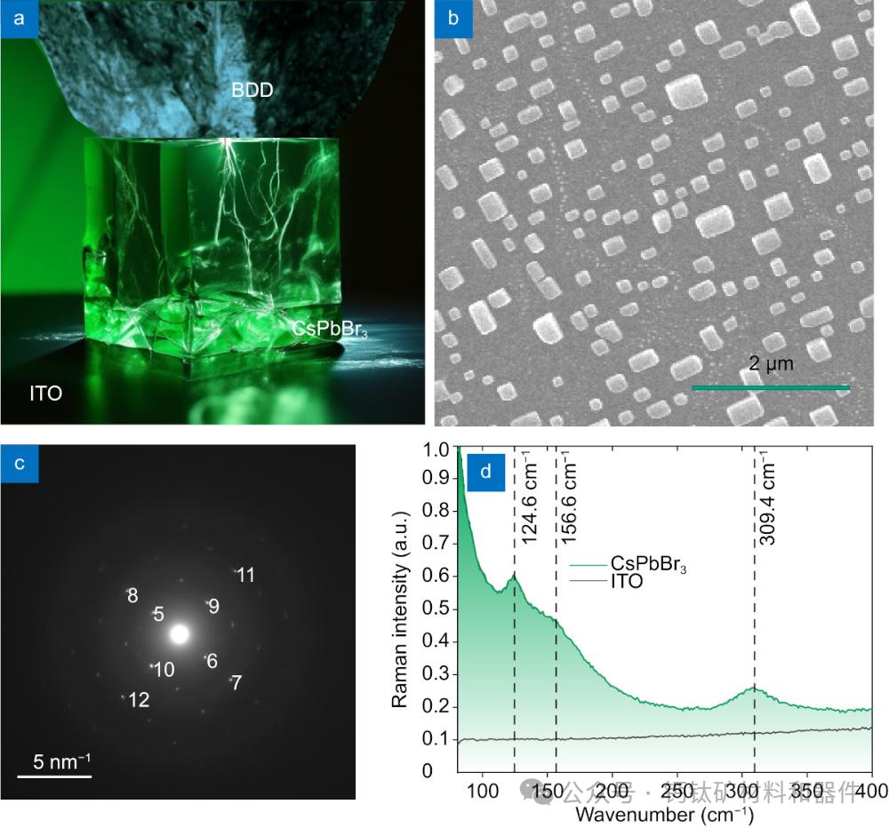 (a) 基于氧化铟锡 (ITO) 上的单晶与硼掺杂金刚石 (BDD) 接触的钙钛矿纳米忆阻器的示意图。(b)钙钛矿纳米晶体阵列的扫描俯视图。(c) 单个 CsPbBr3 的电子衍射图像纳米晶体。(d) 从单晶阵列获得的拉曼光谱。图片来自:Opto-Electronic Advances