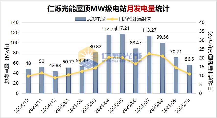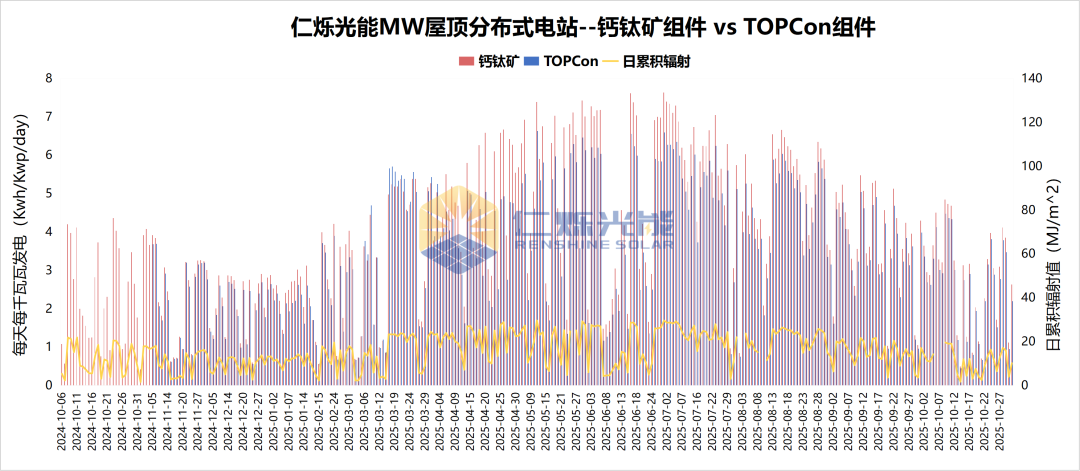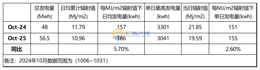 尽管2025年10月整体辐射值低于2024年10月,但由于钙钛矿组件优异的弱光发电特性,发电量有所提高。