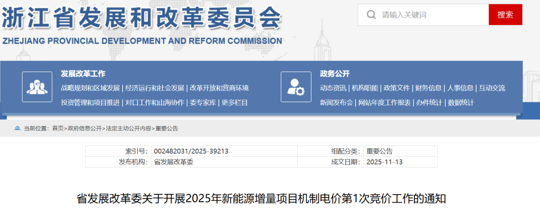 根据《关于深化新能源上网电价市场化改革 促进新能源高质量发展的通知》(发改价格〔2025〕136号)《浙江省新能源上网电价市场化改革实施方案》及配套实施细则(浙发改能源〔2025〕250号)等文件要求,现将2025年新能源增量项目机制电价第1次竞价工作有关事项通知如下: