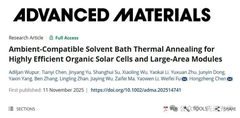 Wupur, A., Chen, T., Yu, J., Su, S., Wu, X., Li, Y., Zhu, Y., Dong, J., Yang, Y., Zhang, B., Zhan, L., Wu, J., Ma, Z., Li, Y., Fu, W., Chen, H., Ambient-Compatible Solvent Bath Thermal Annealing for Highly Efficient Organic Solar Cells and Large-Area Modules.Adv. Mater. 2025, e14741.