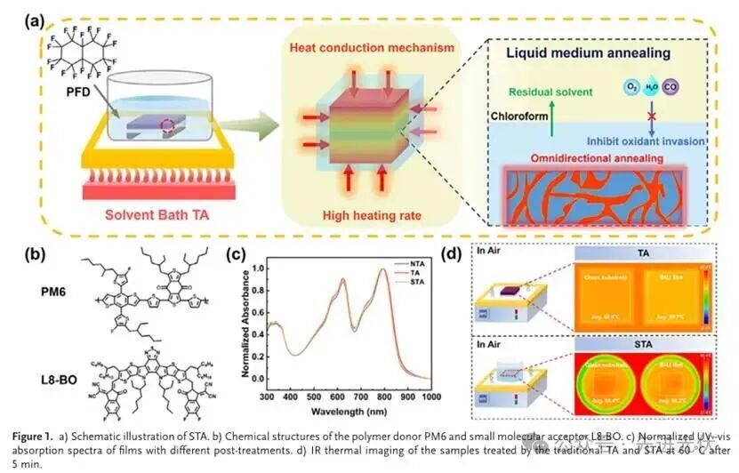 此图展示了STA的创新原理及其对活性层光学性质的影响。通过示意图直观对比了TA与STA的热传递方式差异,STA利用PFD实现快速均匀加热并隔绝氧气和水分。化学结构图明确了PM6给体和L8-BO受体的材料体系,而紫外-可见吸收光谱和红外热成像则证实STA处理能引起吸收光谱蓝移,并提供更均匀的基底温度分布,为后续性能优化奠定基础。