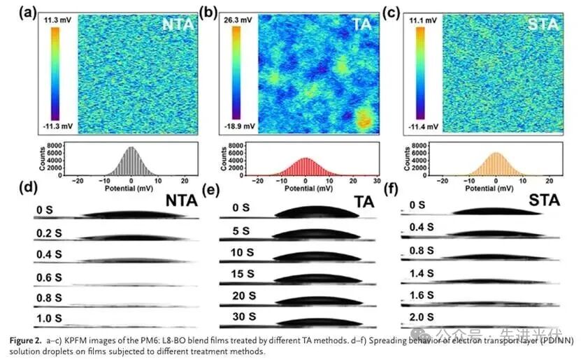 该图通过开尔文探针力显微镜(KPFM)和电子传输层溶液铺展行为揭示了不同退火方法对活性层表面性质的关键影响。KPFM图像显示STA处理的薄膜表面电势分布更均匀,远优于传统TA,这有利于载流子提取。同时,接触角测试和溶液铺展实验表明STA薄膜具有更优的亲水性,使电子传输层溶液能快速均匀铺展,有效避免了界面去湿问题,提升了器件界面质量。