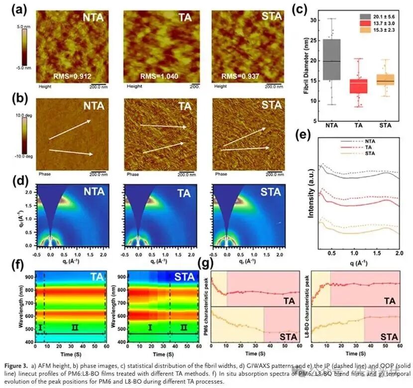 结合原子力显微镜、掠入射广角X射线散射和原位紫外-可见吸收光谱,此图深入分析了退火处理对活性层纳米尺度形貌和结晶行为的调控作用。STA处理诱导形成了更精细(平均直径约13.7 nm)且连续的纤维状网络结构,其晶体相干长度增加至21.645 nm,表明分子堆积有序度更高。原位光谱进一步揭示STA具有更长的分子重组阶段(约35秒),为形成优化形态提供了充分时间,这是其性能优异的结构基础。
