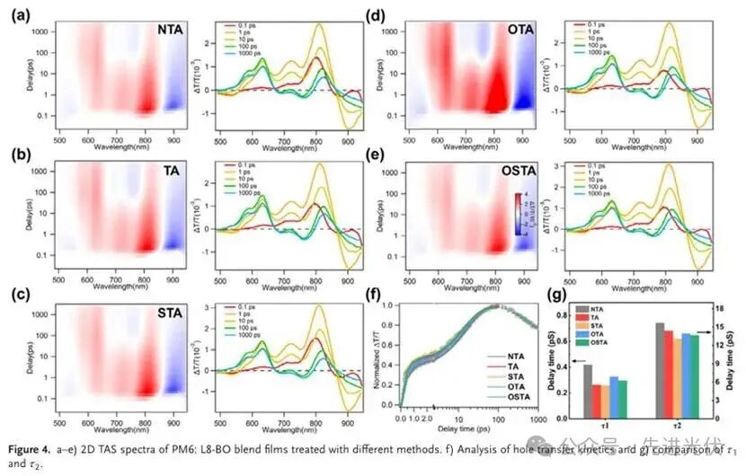 通过瞬态吸收光谱技术,该图直接观测了不同退火处理后活性层内的空穴转移动力学过程。STA处理的薄膜表现出最快的空穴转移动力学,其初始快速转移时间(τ₁)和后续慢速转移时间(τ₂)均优于传统TA处理,表明STA优化了给体-受体界面处的垂直组分分布和分子堆积,从而显著提升了激子解离和电荷生成效率,且该优势在空气环境中依然保持。