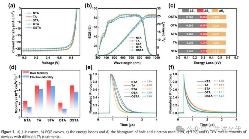 此图综合展示了基于不同退火方法制备的有机太阳能电池的光伏性能参数和内部电荷行为。电流密度-电压曲线和外量子效率谱表明STA器件获得了最高的光电转换效率(19.05%),其能量损失分析、空间电荷限制电流法测得的载流子迁移率以及瞬态光电流/光电压测量共同证实,STA处理带来了更平衡的电荷传输、更低的非辐射复合损失和更高效的电荷提取能力,是器件性能全面提升的关键。