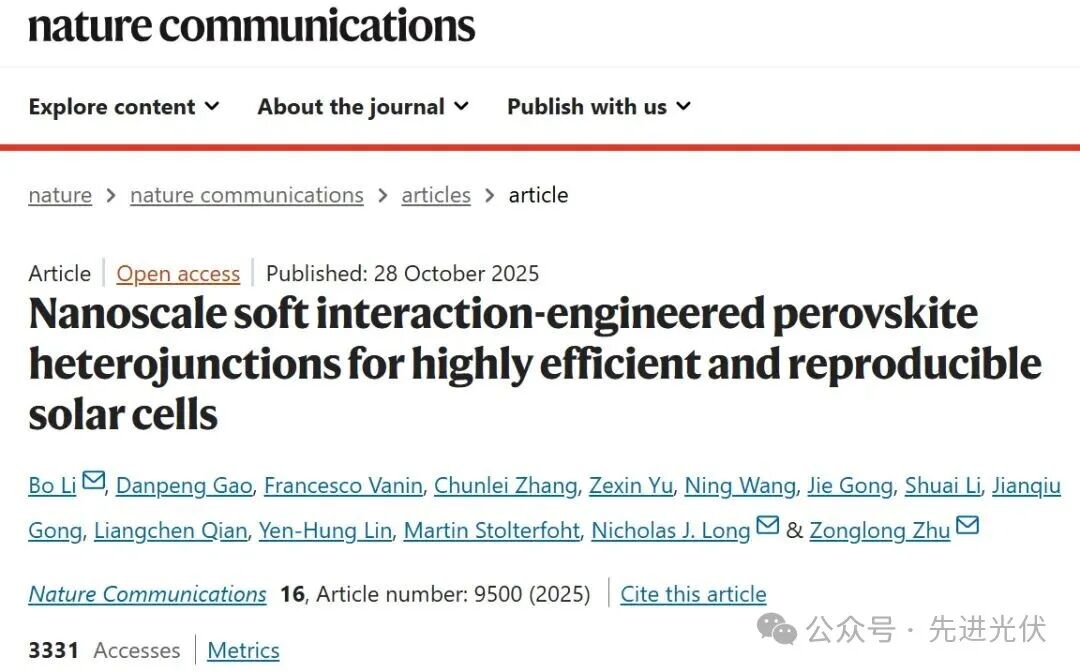 Li, B., Gao, D., Vanin, F. et al. Nanoscale soft interaction-engineered perovskite heterojunctions for highly efficient and reproducible solar cells. Nat Commun 16, 9500 (2025).