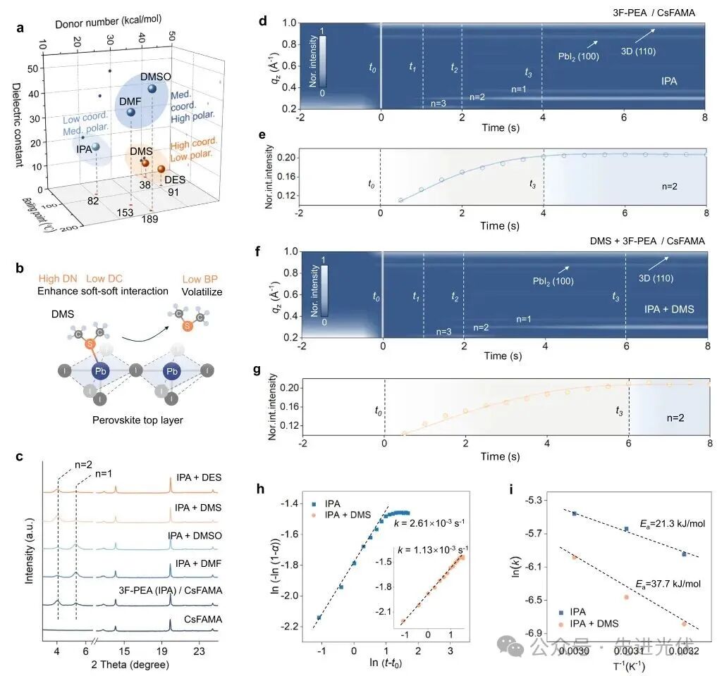 图1系统展示了基于软-软相互作用调控钙钛矿异质结构建的机理与过程。其中图a比较了不同溶剂的供体数、介电常数和沸点等关键物理化学参数,突显出DMS和DES具有高配位能力和低极性的独特优势;图b则以示意图形式描绘了DMS作为软路易斯碱与钙钛矿表层软酸Pb²⁺之间的特异性相互作用,该相互作用遵循硬软酸碱理论,能有效调控界面反应动力学;图c的XRD图谱进一步证实,相较于其他添加剂,DMS调制后的异质结薄膜更倾向于形成主导的n=2相低维钙钛矿,避免了n=1相过多导致的电荷传输恶化,显示出DMS在引导高纯度相形成方面的显著效果。d至i子图通过时间分辨GIWAXS等技术深入揭示了DMS对异质结形成动力学的调控机制;图d和f分别对比了有无DMS时异质结形成的动态散射谱,图e和g则对应展示了n=2相归一化积分强度的时间演化曲线,清晰表明DMS的引入显著延缓了维度缩减过程的反应速率,使得n=3相能够更稳定地存在并逐步转化为n=2和n=1相;图h的Avrami-Erofeev模型分析拟合出的反应速率常数进一步证实DMS处理体系的成核生长过程更慢,而图i由Arrhenius公式计算得到的活化能显示DMS使反应活化能从21.3 kJ/mol提升至37.7 kJ/mol,从能量角度阐明DMS通过增强反应能垒实现了对结晶动力学的精细控制,从而有利于形成更均匀、缺陷更少的界面结构。