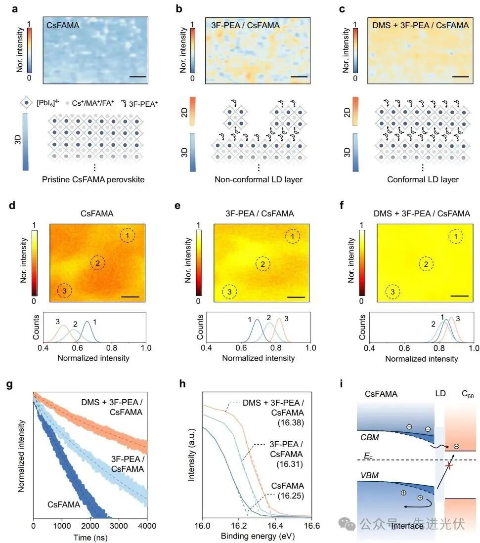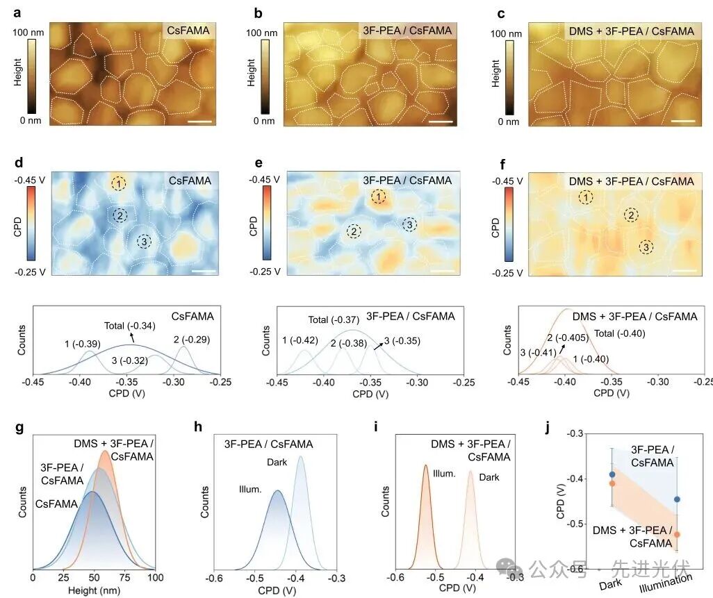 图2通过AFM和KPFM在纳米尺度上分析了异质结的形貌和电子均匀性;图a-c的AFM图像显示,未经处理的3F-PEA/CsFAMA异质结表面存在明显的纳米级形态不均匀性和突起,而DMS调制后的薄膜则呈现出更光滑连续的表面形貌,高度波动显著减小;图d-f的KPFM mapping结果与之对应,原始钙钛矿薄膜及未调制异质结均表现出较大的表面电势起伏和“斑块状”分布,暗示局部能级不匹配,而DMS处理后的异质结则展现出更窄的接触电势差统计分布和相邻区域间一致的电势值,表明软-软相互作用诱导形成了电子结构更均匀的界面层,有效降低了界面处的能量无序性。