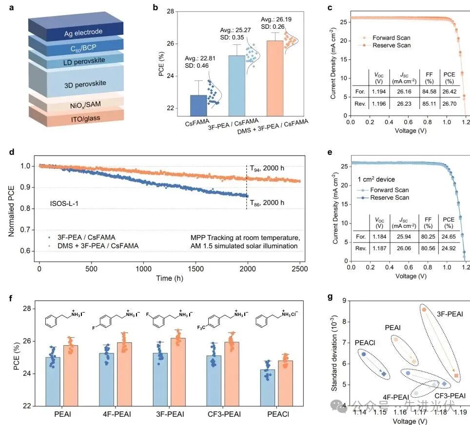 图4 全面评估了光伏器件的性能与稳定性,图a展示了p-i-n型PSCs的器件结构示意图;图b的光伏参数统计表明基于DMS调制异质结的器件获得了26.19%的平均效率,显著高于未处理组,且标准偏差更小,体现了优异的性能重现性;图c的J-V曲线显示冠军器件效率高达26.70%,并获得26.48%的认证效率,其开路电压和填充因子均实现显著提升;图d的长期运行稳定性测试则表明,封装后的DMS调制器件在连续1太阳光照下进行最大功率点跟踪2000小时后仍能保持94%以上的初始效率,远超对照组的86%,凸显了该策略在提升器件工作寿命方面的巨大潜力。