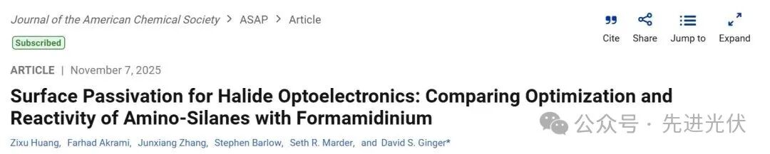 Huang, Z.; Akrami, F.; Zhang, J.; Barlow, S.; Marder, S. R.; Ginger, D. S. Surface Passivation for Halide Optoelectronics: Comparing Optimization and Reactivity of Amino-Silanes with Formamidinium. J. Am. Chem. Soc. 2025.