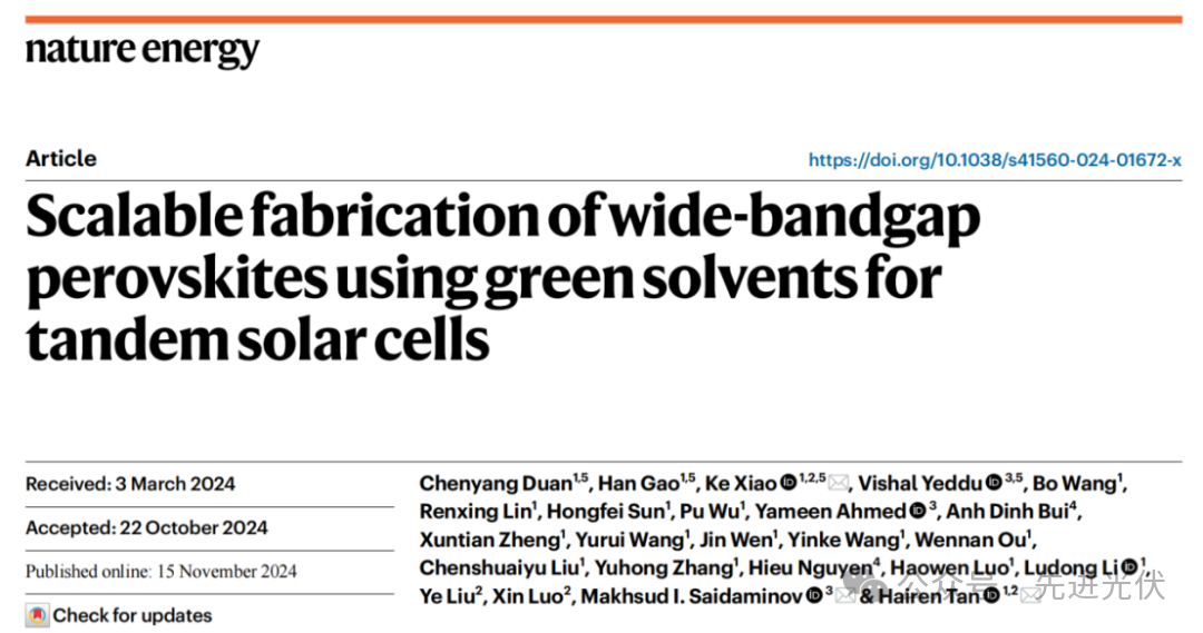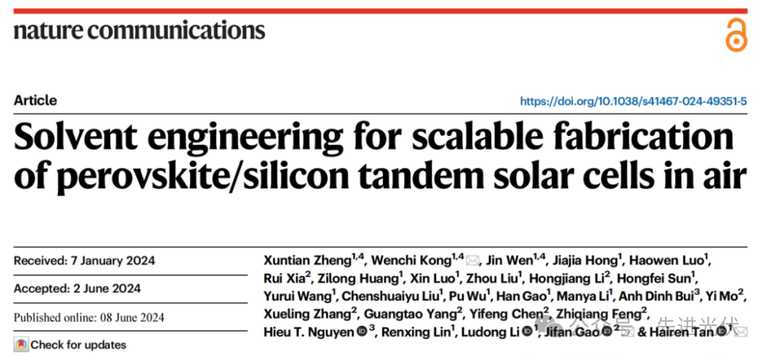 近年来,钙钛矿基叠层太阳能电池因其高效率和低成本潜力备受关注,但其规模化制备仍面临空气中水分导致薄膜质量下降、溶剂毒性及工艺兼容性等挑战。南京大学谭海仁团队在Nature Energy和Nature Communications上发表的两项研究,分别从空气中绿色溶剂系统开发和宽带隙钙钛矿的溶剂工程两方面取得了突破性进展,为实现高效、稳定、可规模化生产的全钙钛矿叠层和钙钛矿/晶硅叠层电池提供了可行路径。