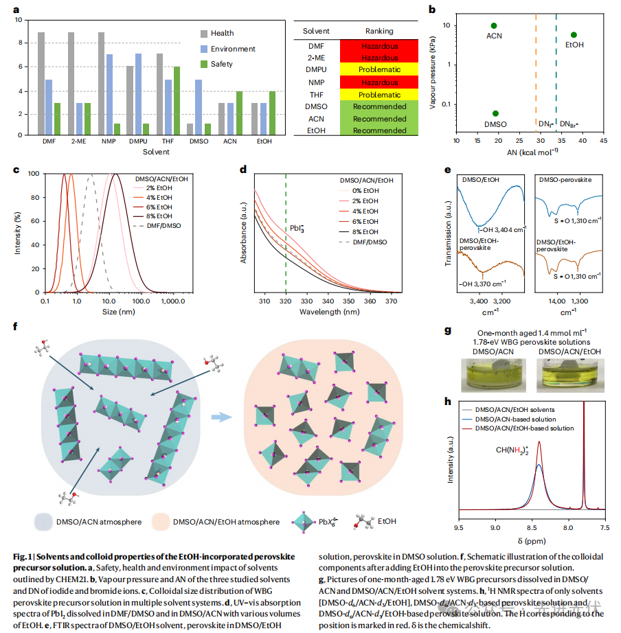本图通过CHEM21溶剂评估体系(a)证实DMSO/ACN的绿色安全性,而DMF被归类为有害溶剂。不同醇类的物理参数(b)表明EtOH受体数高、蒸气压大,可增强卤素结合并加快挥发,促进宽禁带钙钛矿结晶。EtOH的引入显著调控胶体尺寸分布(c),使峰值从无EtOH时的无规分布变为10 nm的均匀高斯分布。UV-Vis光谱(d)显示EtOH抑制PbI₃⁻络合物形成,FTIR谱(e)证明EtOH通过-OH键与钙钛矿组分相互作用。核磁共振数据(h)进一步揭示EtOH与FA⁺的NH基团形成氢键,有效抑制FA⁺去质子化降解,使前驱体溶液稳定性提升至30天(g)。这些结果从分子层面阐释了EtOH调控结晶动力学的作用机制。